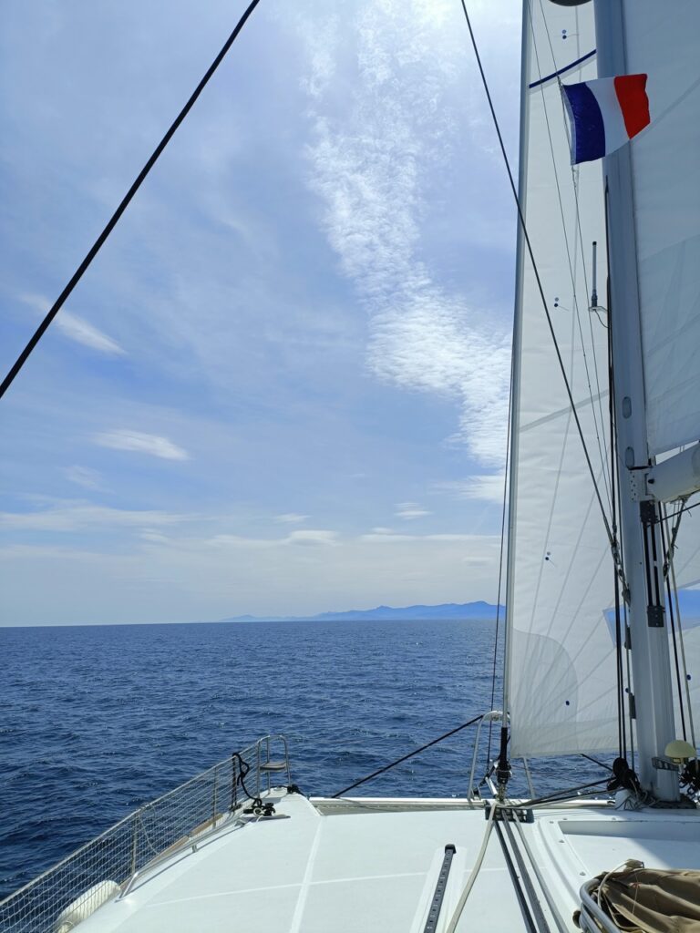 Mardi 11, dans la nuit, la houle nous ballotte de plus en plus et nous réveille vers 4h30, rendant le mouillage vraiment inconfortable. A 5h, je décide de partir pour ne plus être secoué, nous reprenons la route direction Port Leucate. Il y a beaucoup de houle et on se fait secouer, j’espère que Papi et Mamie ne seront pas mal. Et bien non, ils se lèvent vers 8h, sans mal de mer, ce qui n’est pas le cas d’Aurélia, qui a un peu de mal.